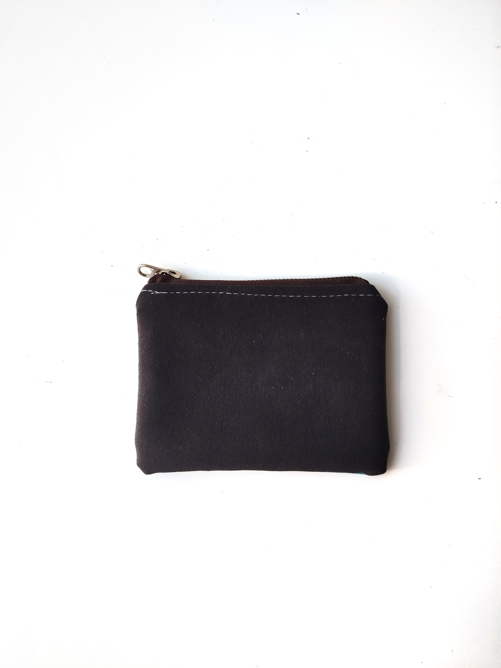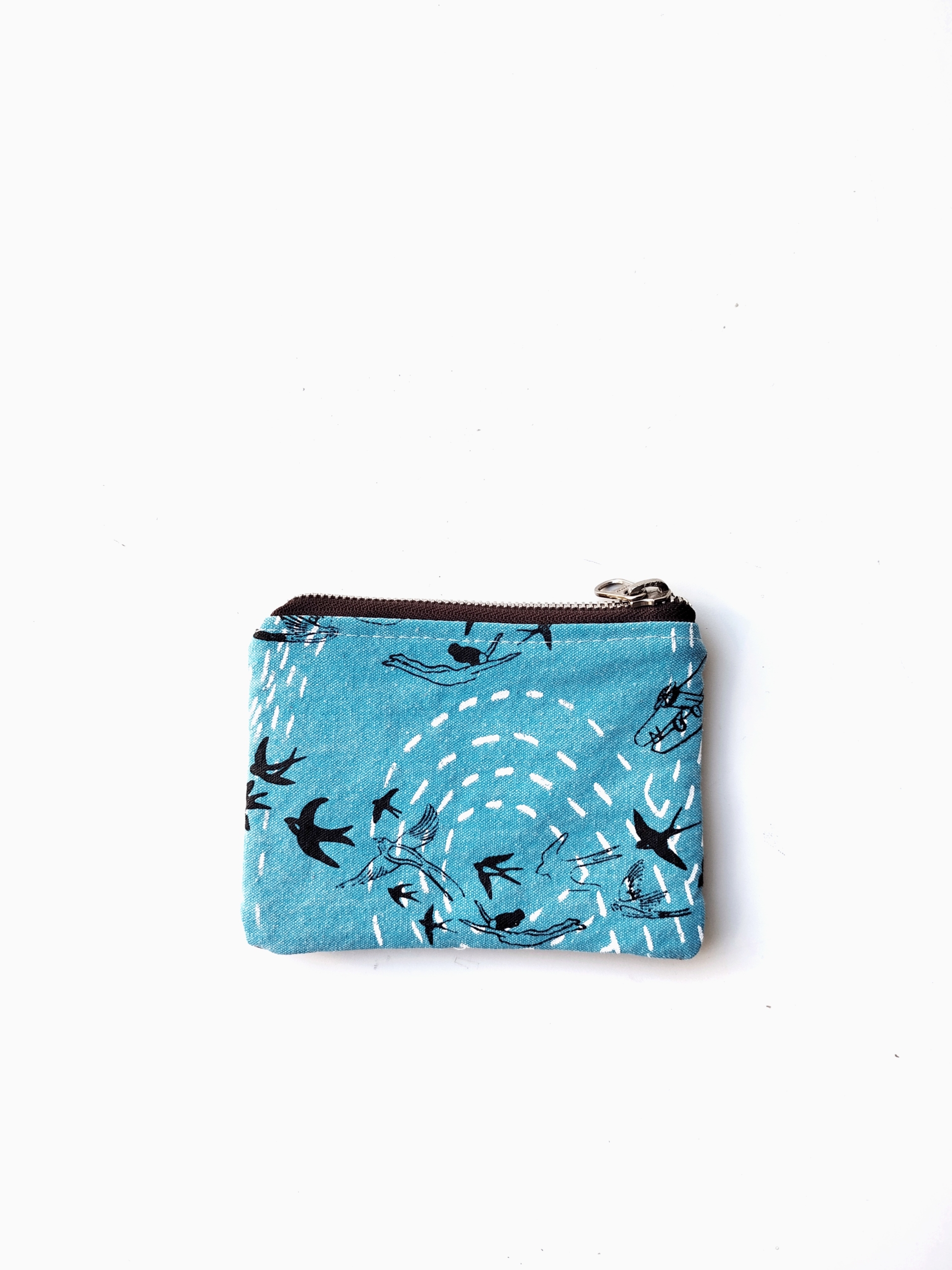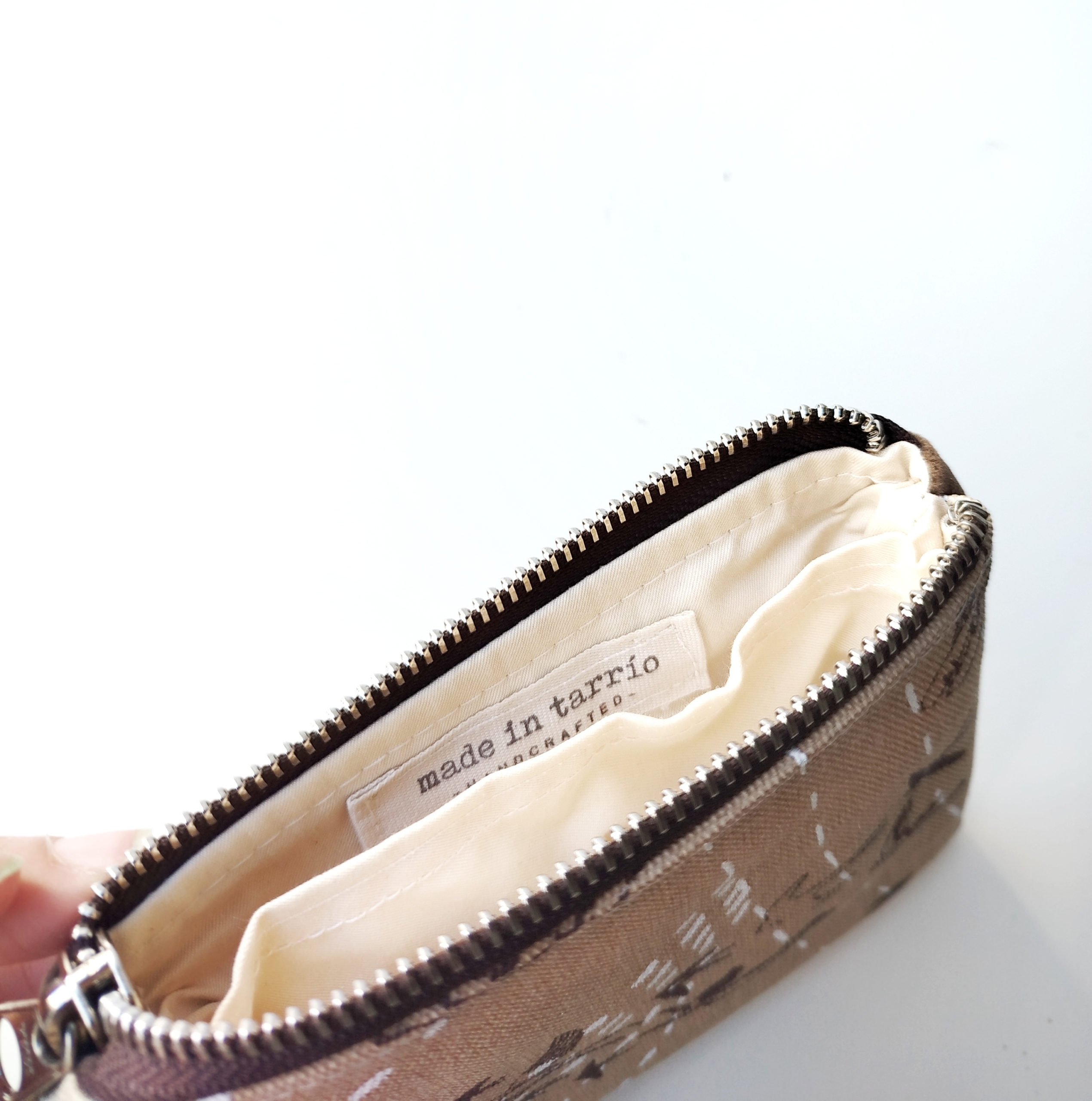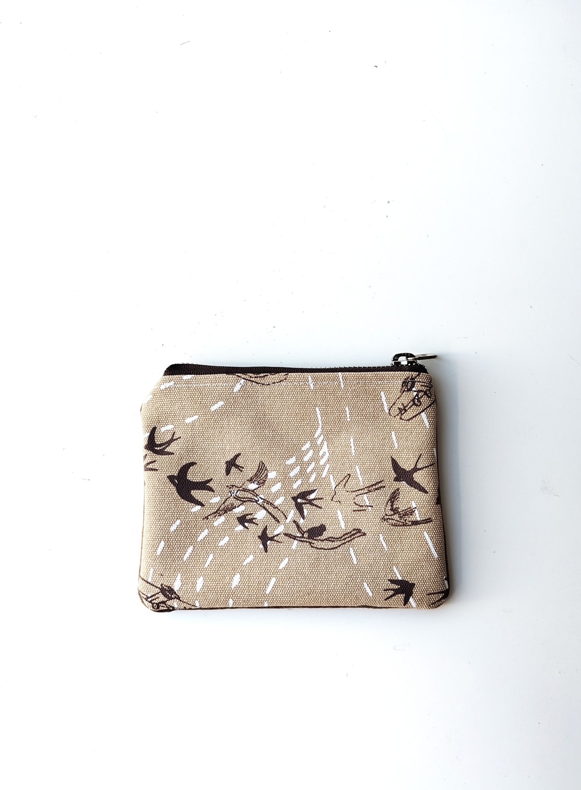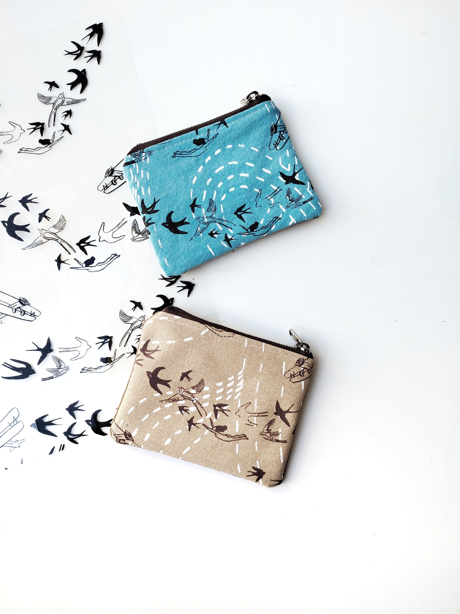 Cartera o monedero con separador con forma rectangular para monedas, billetes y tarjetas, confeccionado en lona de algodón azul / beige estampada con diseño Miss Golondrina,  con tinta blanca y negra/ blanca y marrón. La trasera es de tapicería suave, lisa. El forro es de algodón beige y puede variar según disponibilidad.