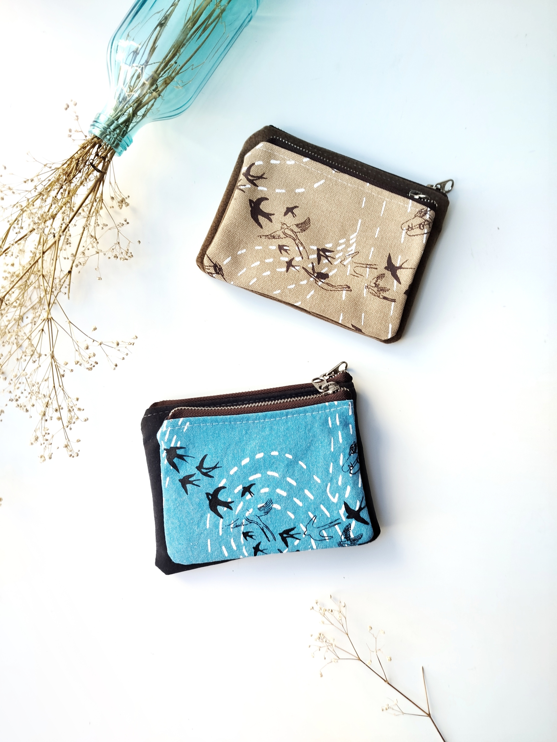 En el compartimento más pequeño (monedero estampado con peces voladores) caben tarjetas, monedas, auriculares, pendrives o llaves; mientras que el compartimento más grande (no va estampado) puedes usarlo como billetera o para meter cositas de tamaño mediano.
