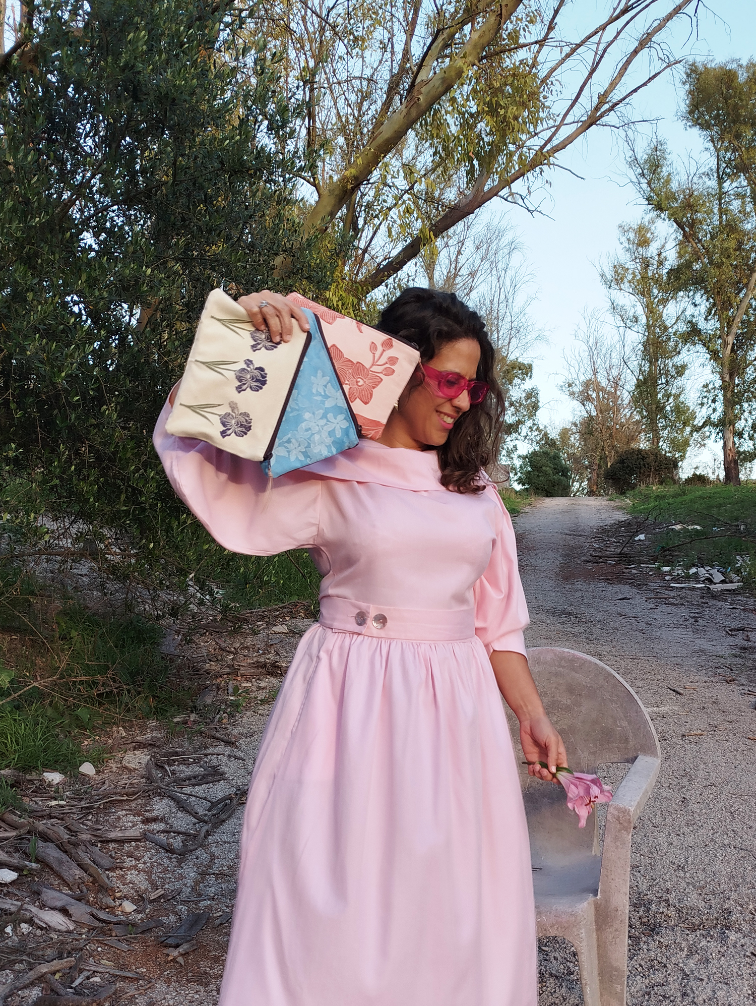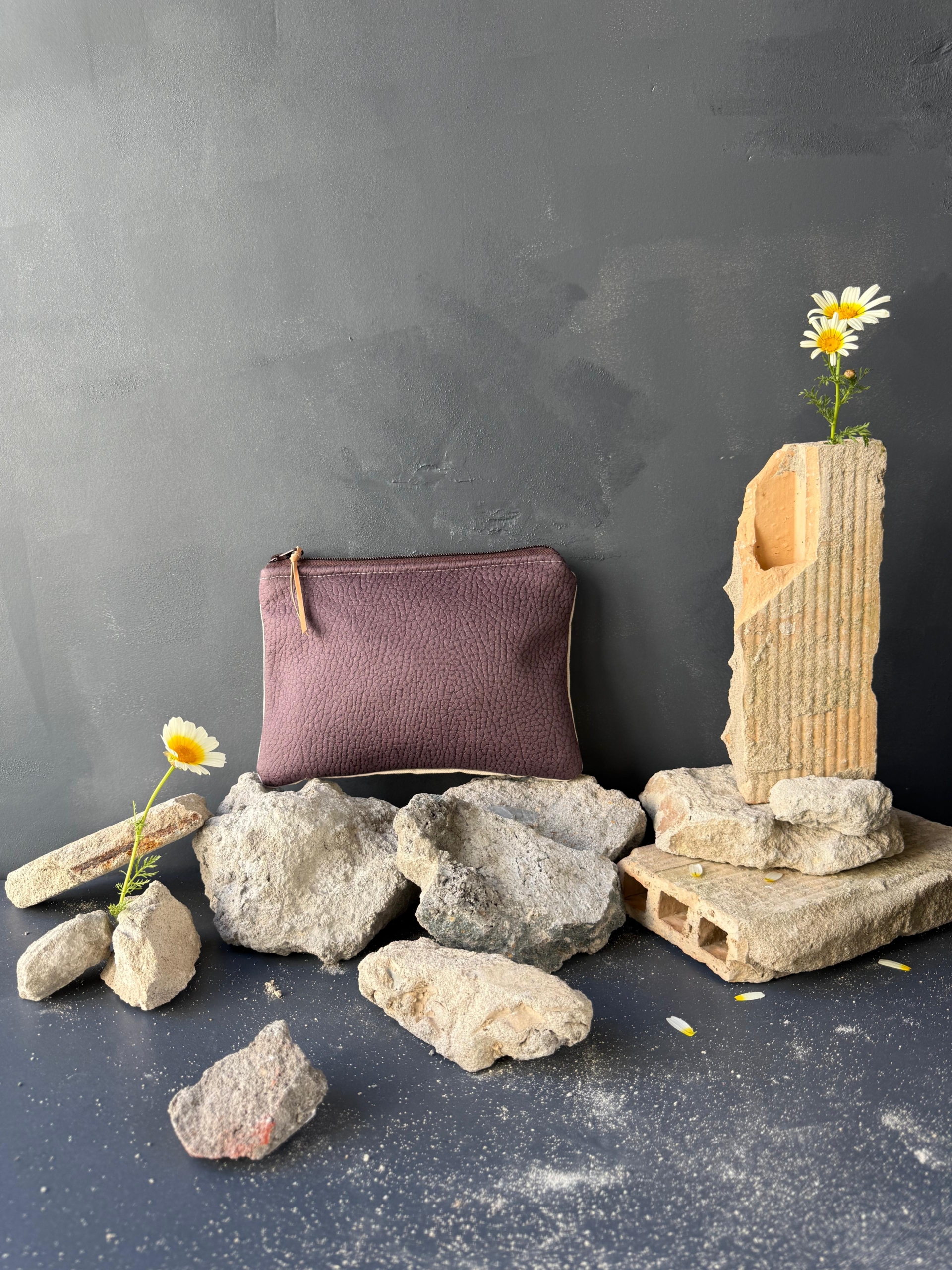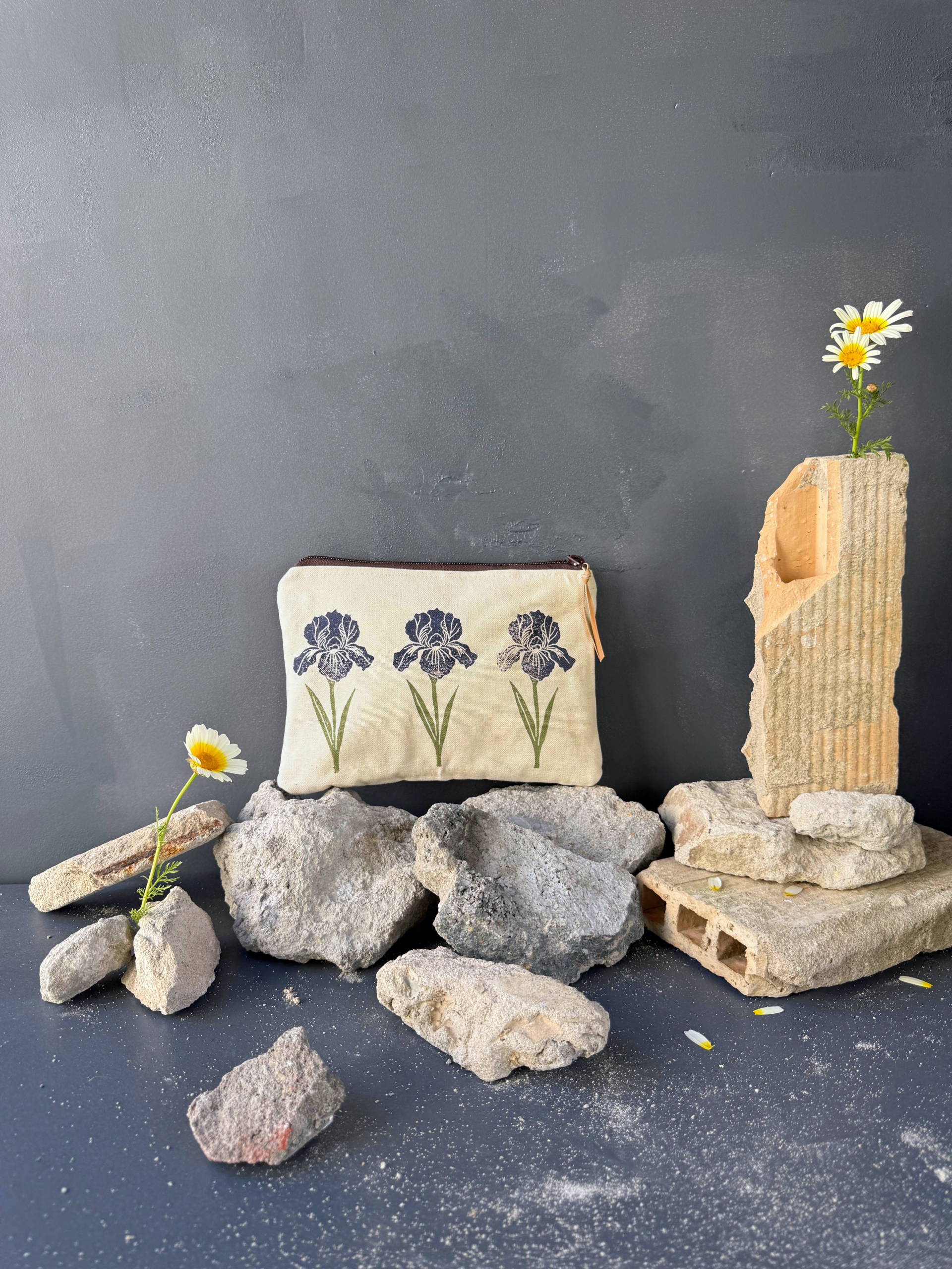Neceser o bolso de mano para llevar lo imprescindible (cartera pequeña, móvil, llaves, pañuelos y barra de labios). Puedes usarlo con asa como cartera de mano o sin asa, como neceser. La parte delantera es una tela de algodón cruda sobre la que estampamos lirios morados y verdes. La parte trasera es de tapicería morada y el forro es de algodón color crudo, aunque puede variar según disponibilidad. El tirador es de cuero vacuno marrón.