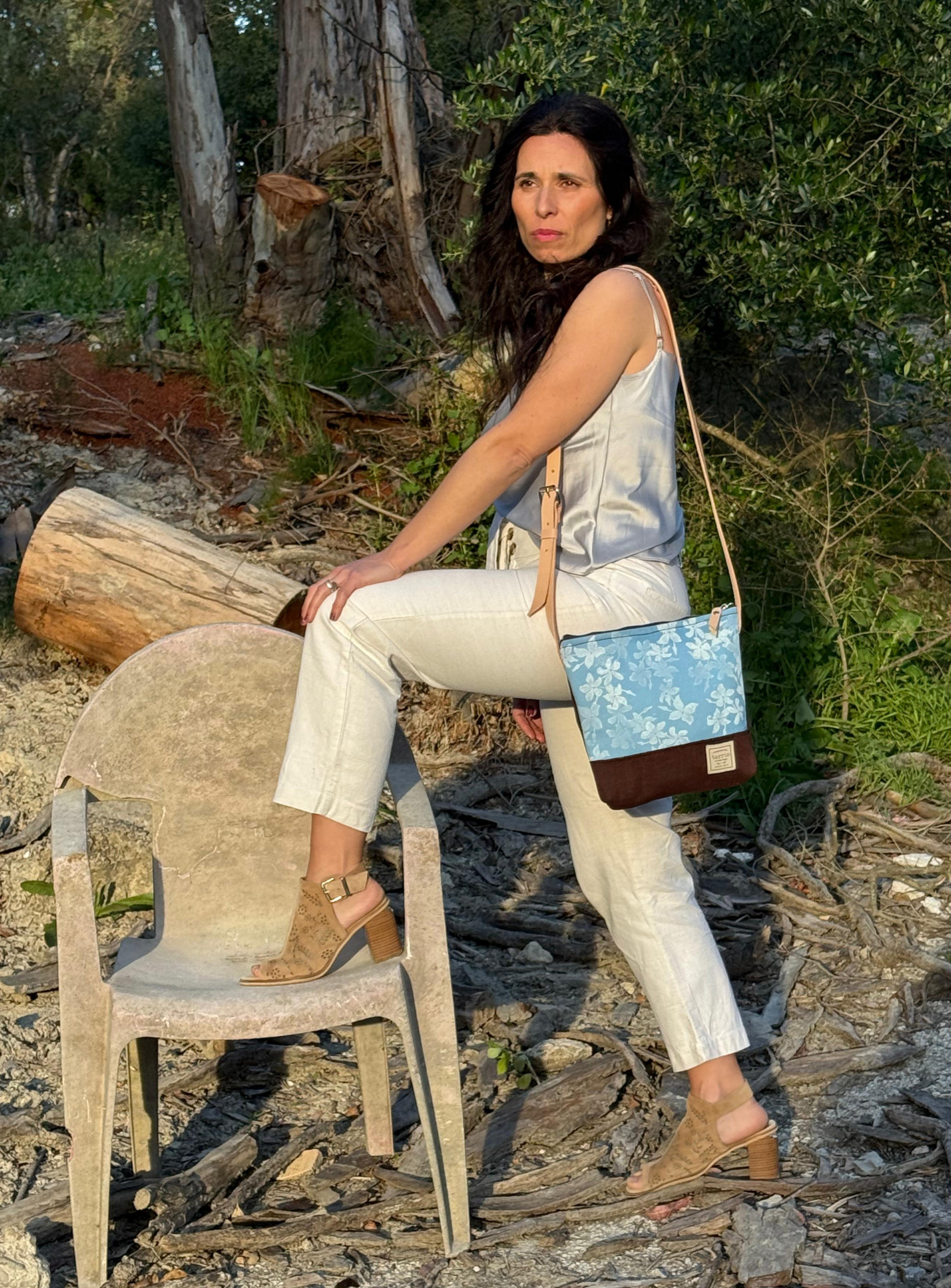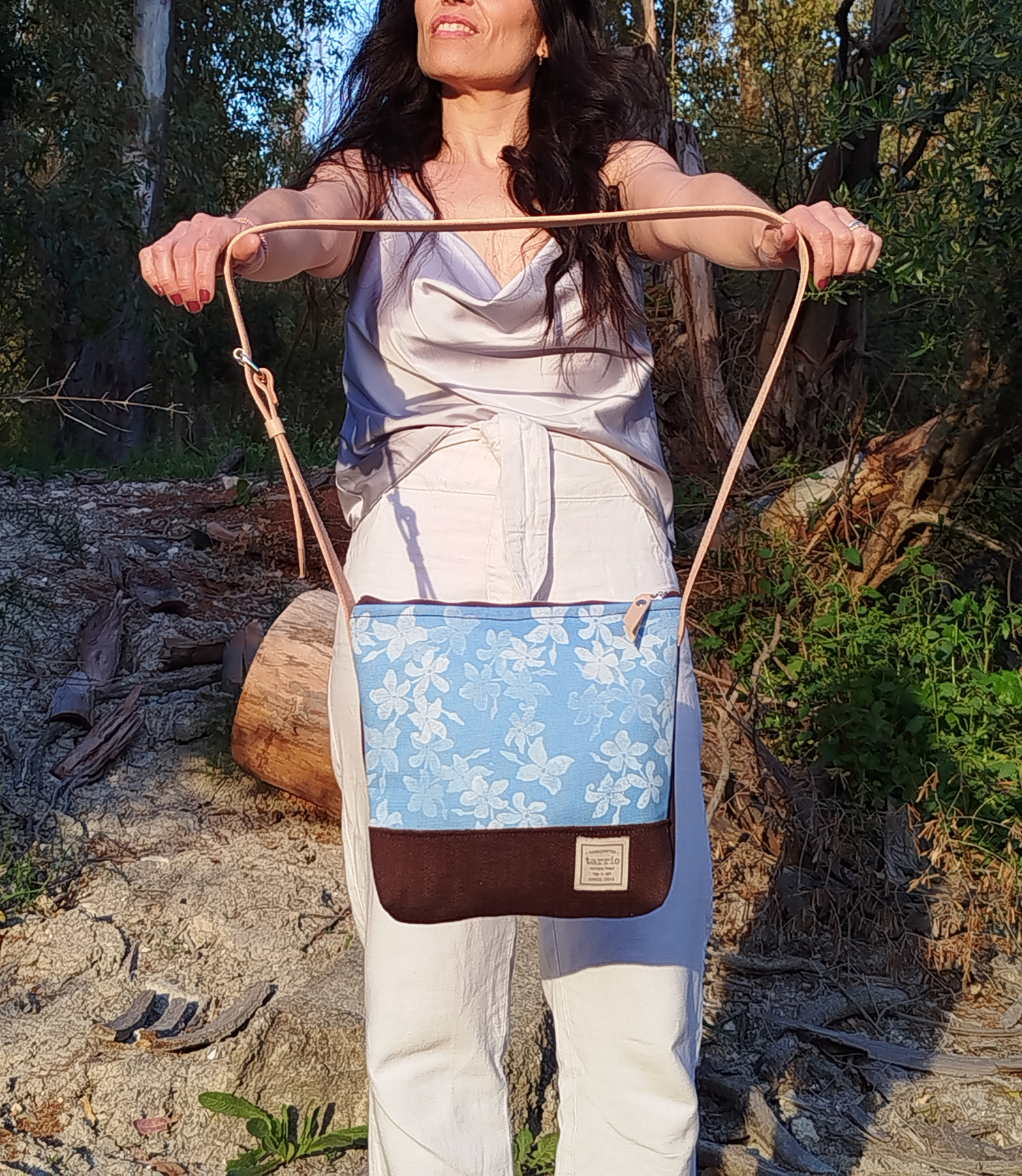 – Materiales: Lona de algodón en celeste y tela de tapicería marrón. Piel de vacuno encerada (primera calidad, 3 mm.), color natural.