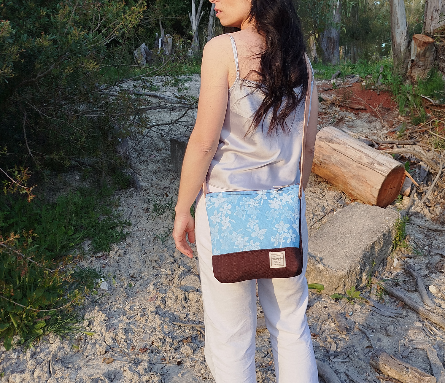 – Estampado: Diseño de jazmines estampados a mano con sellos y tintas ecológicas. Trasera marrón, lisa.