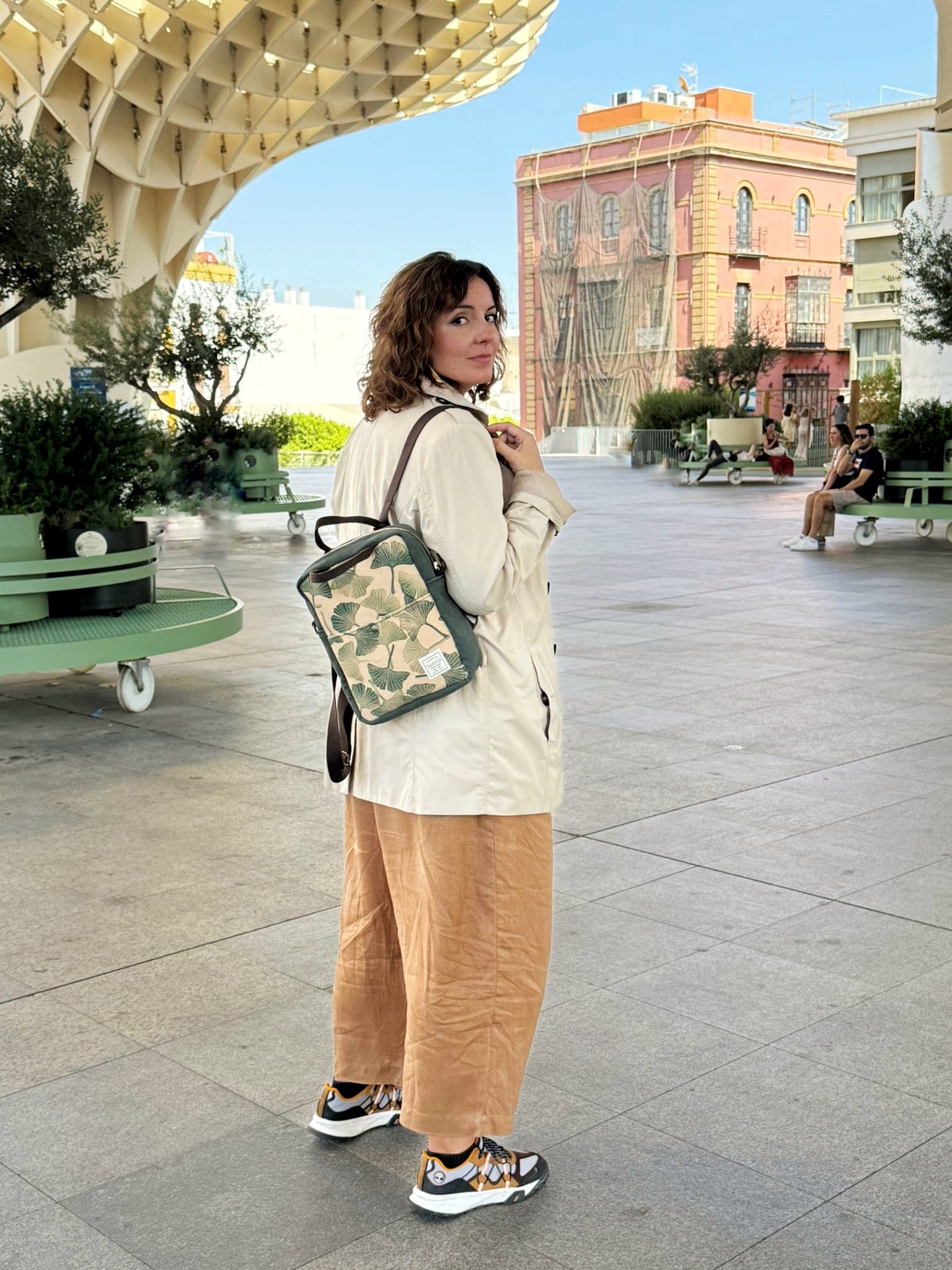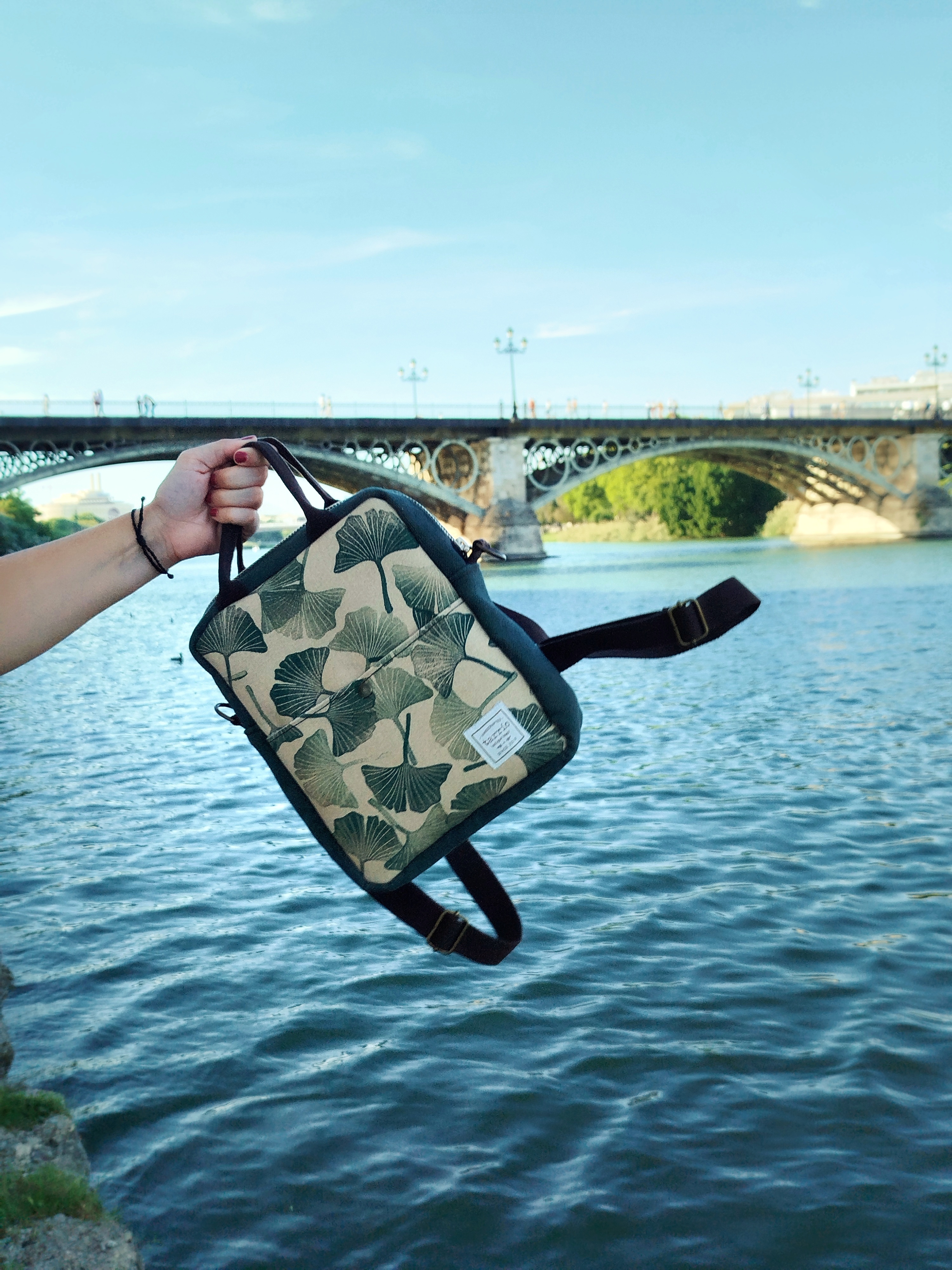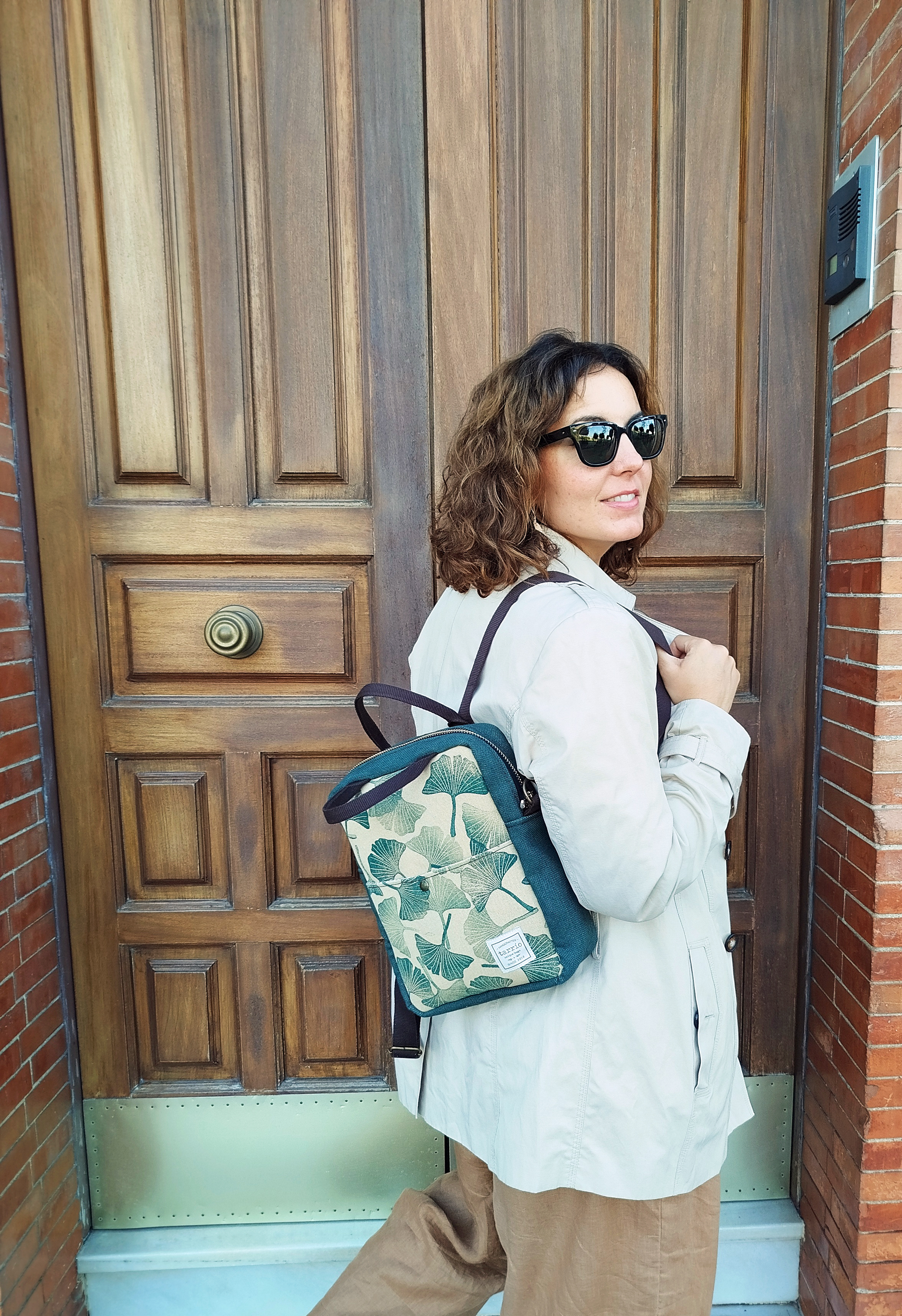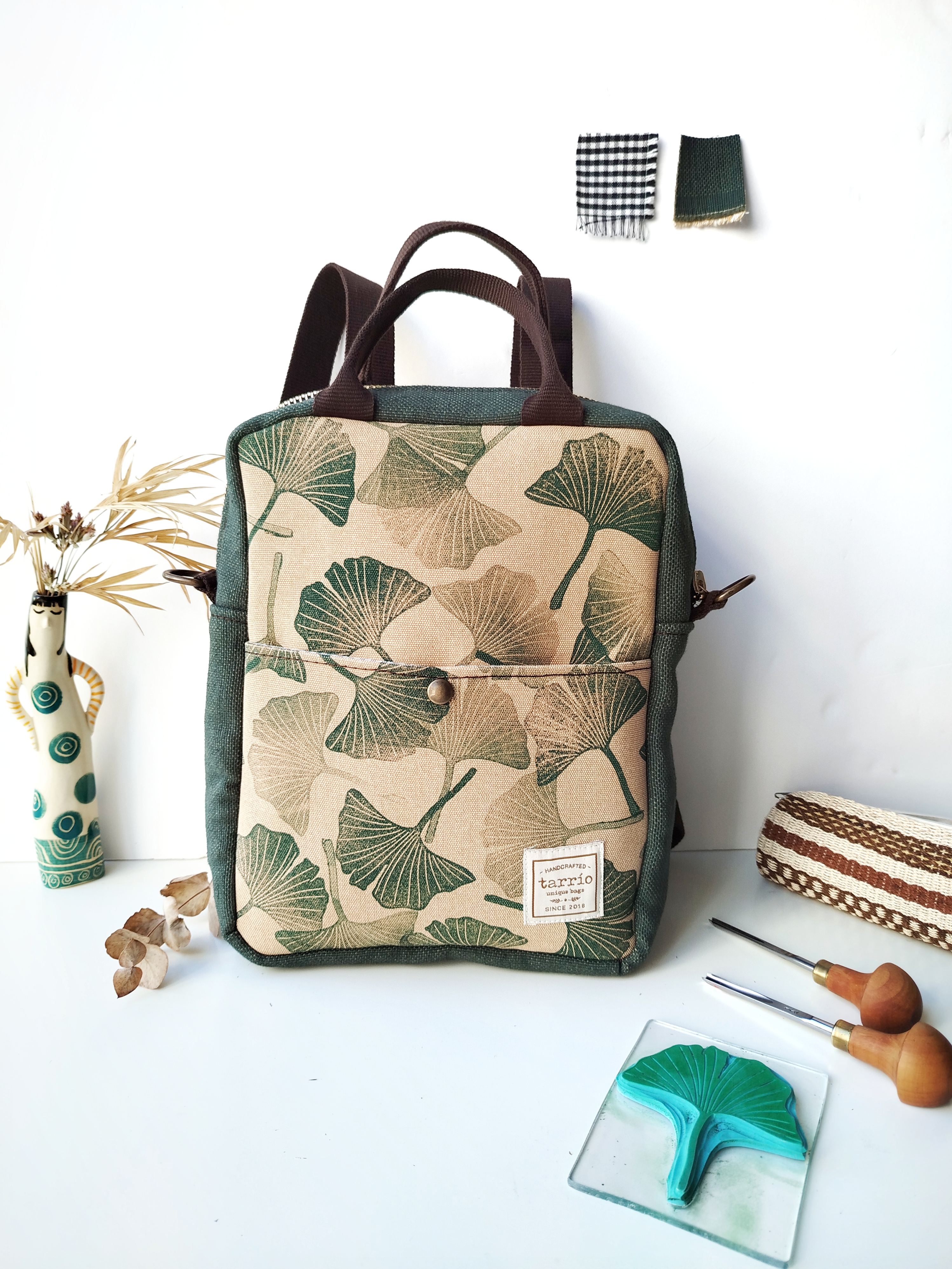 – Estampado: Diseño de hojas de ginkgo biloba estampado a mano con grabado y tintas ecológicas.