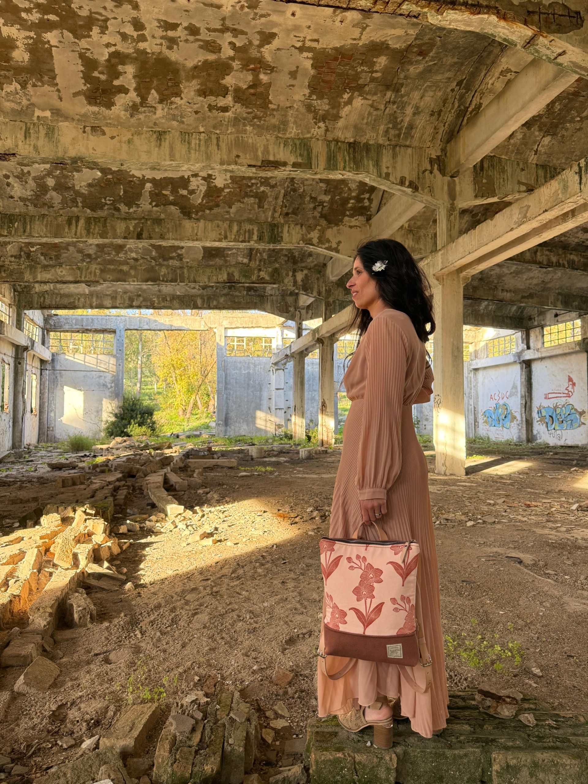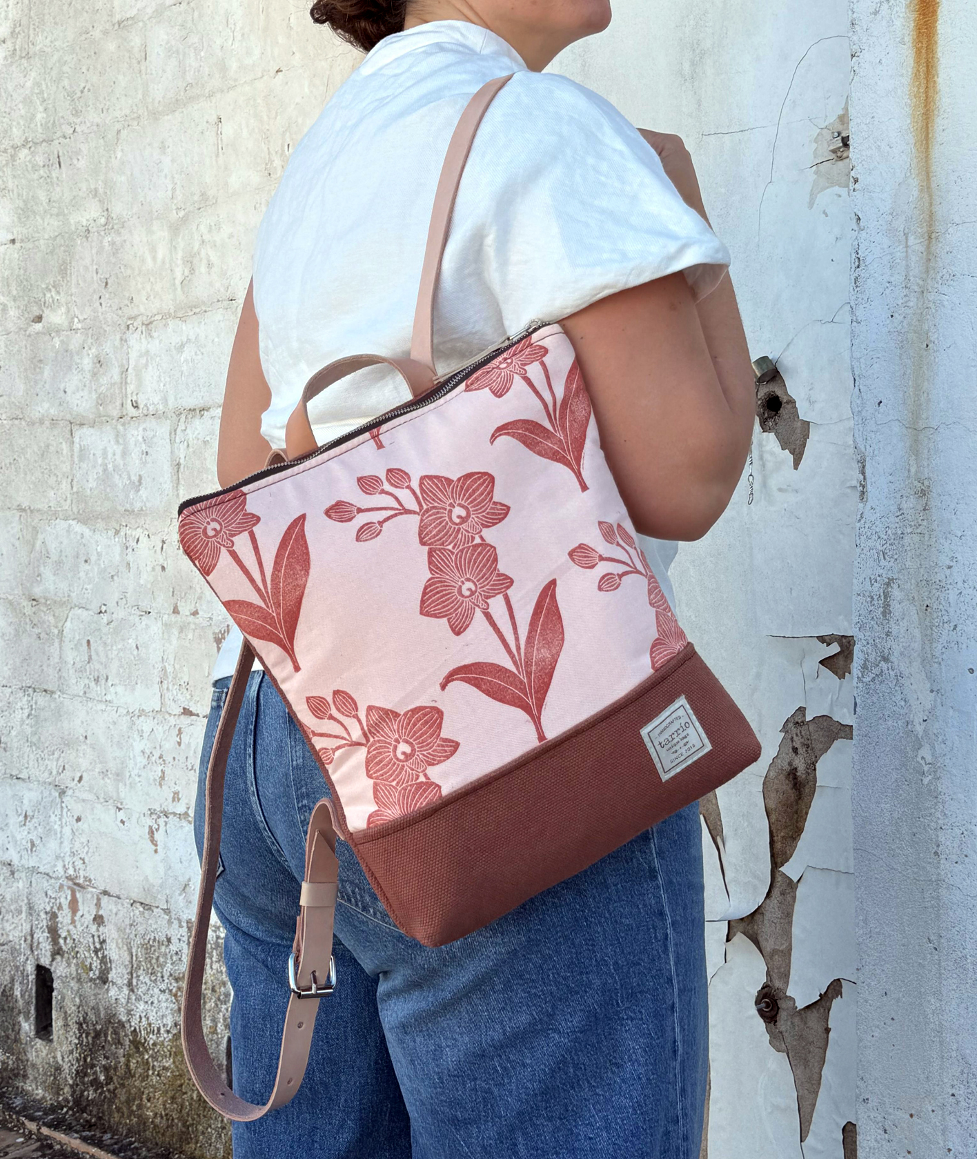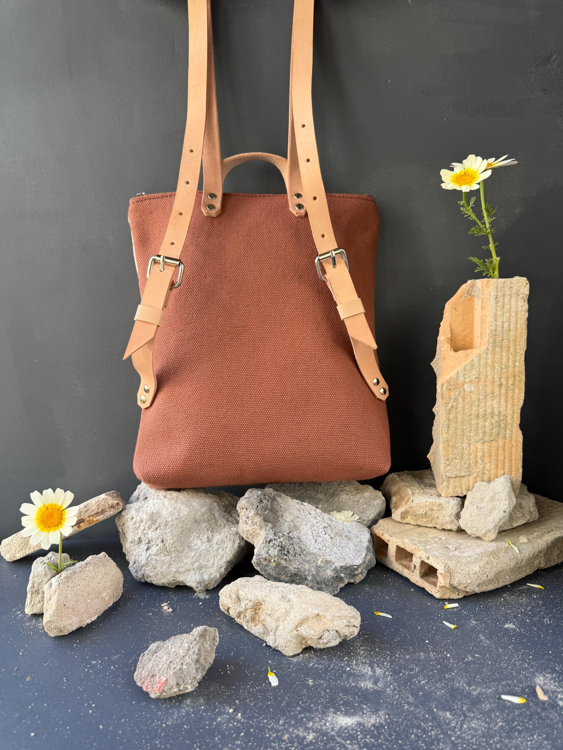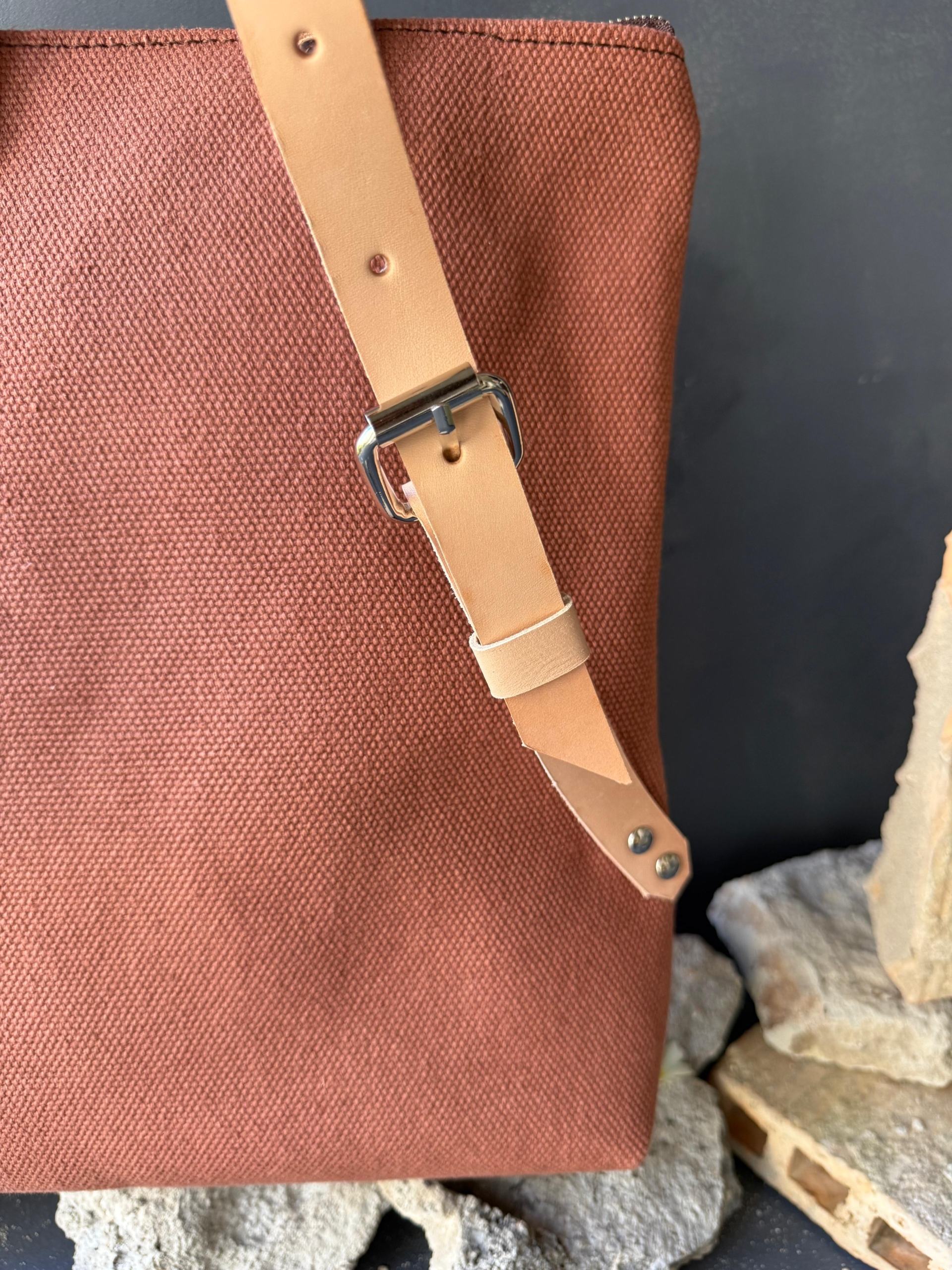 – Materiales: Lonas gruesas de algodón en color rosado y marsala; y piel de vacuno encerada (primera calidad, 3 mm.), color natural.