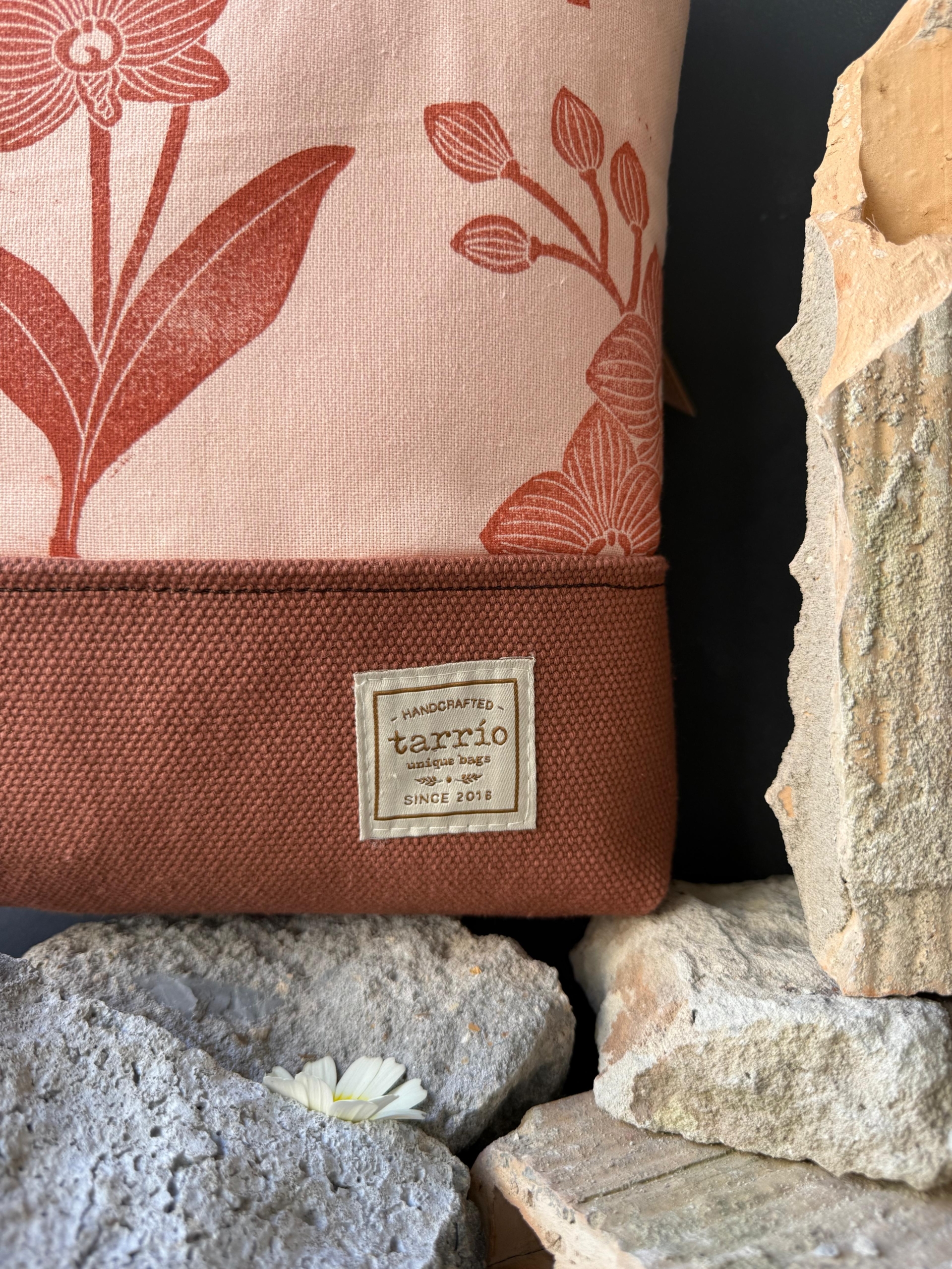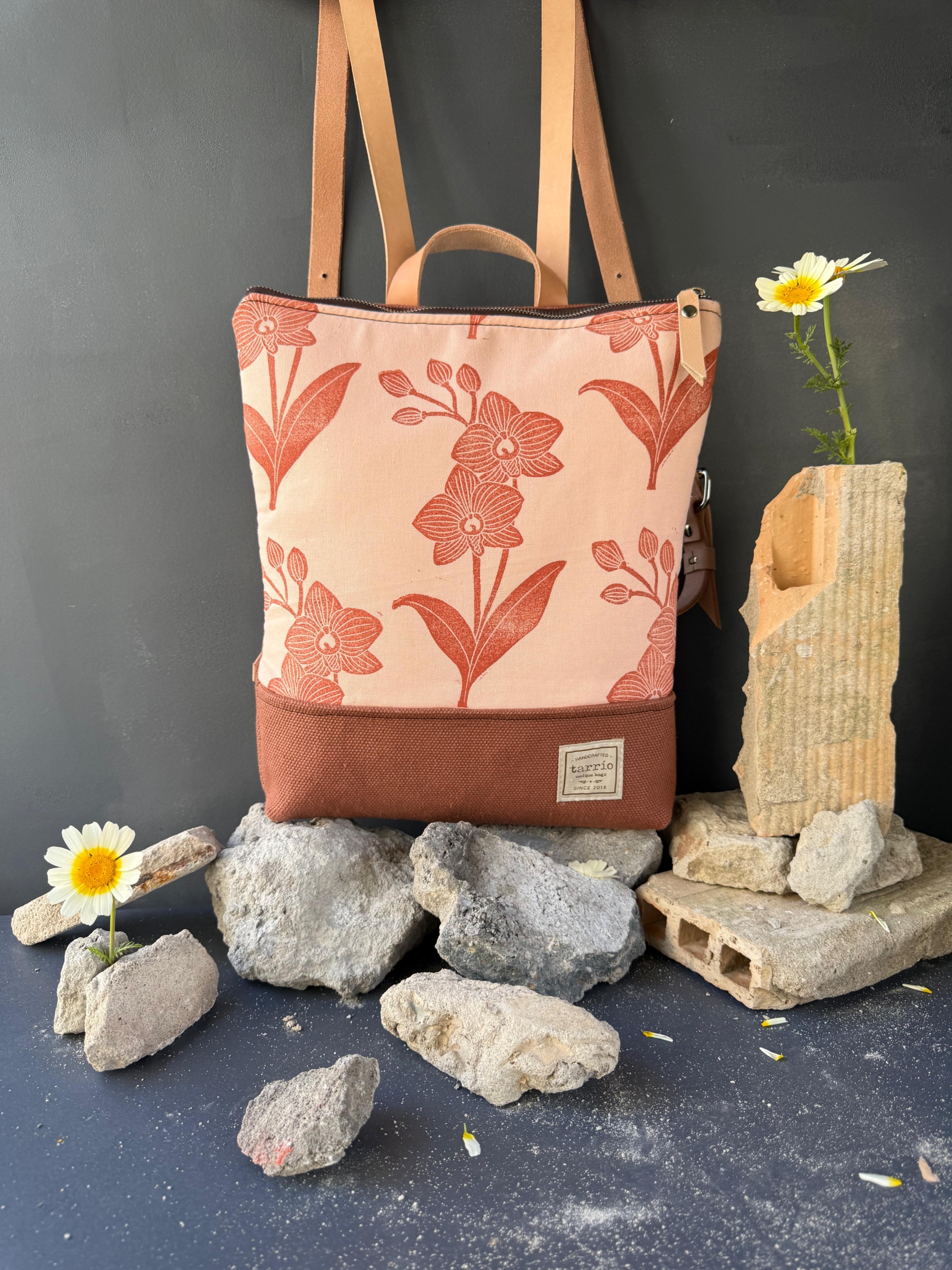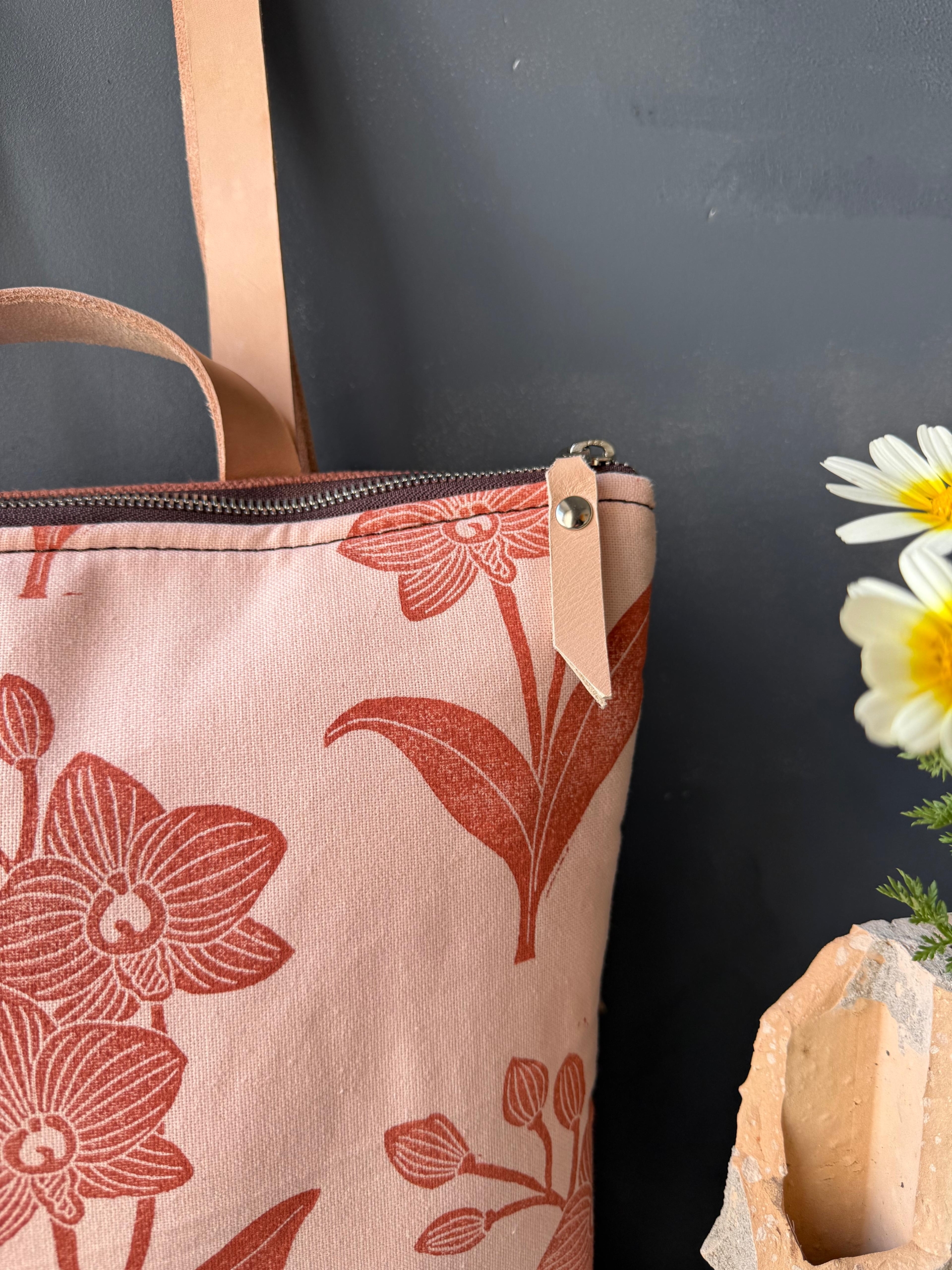 – Estampado: Diseño de Orquídea estampado a mano con sello tallado a mano y tinta ecológica.