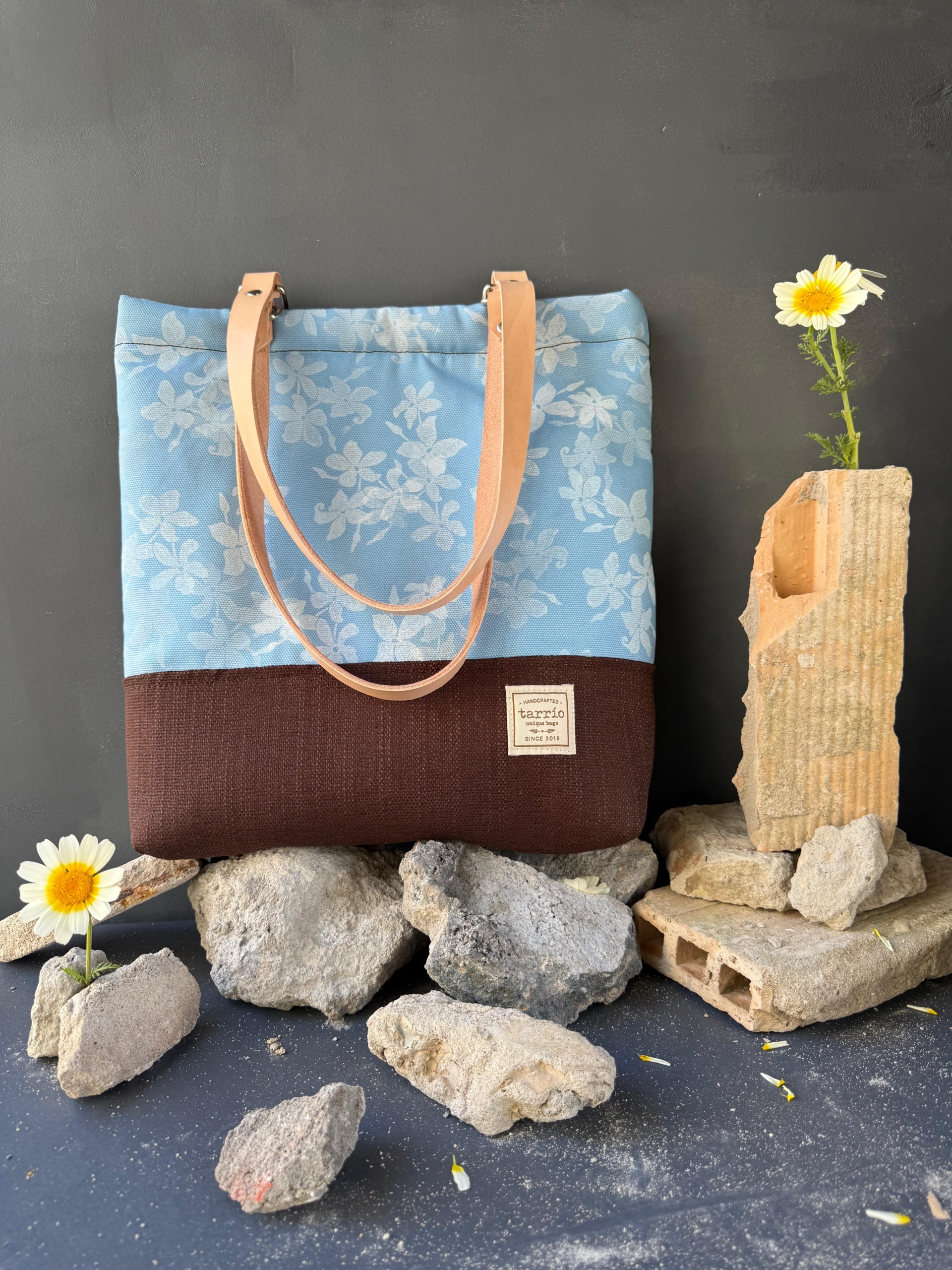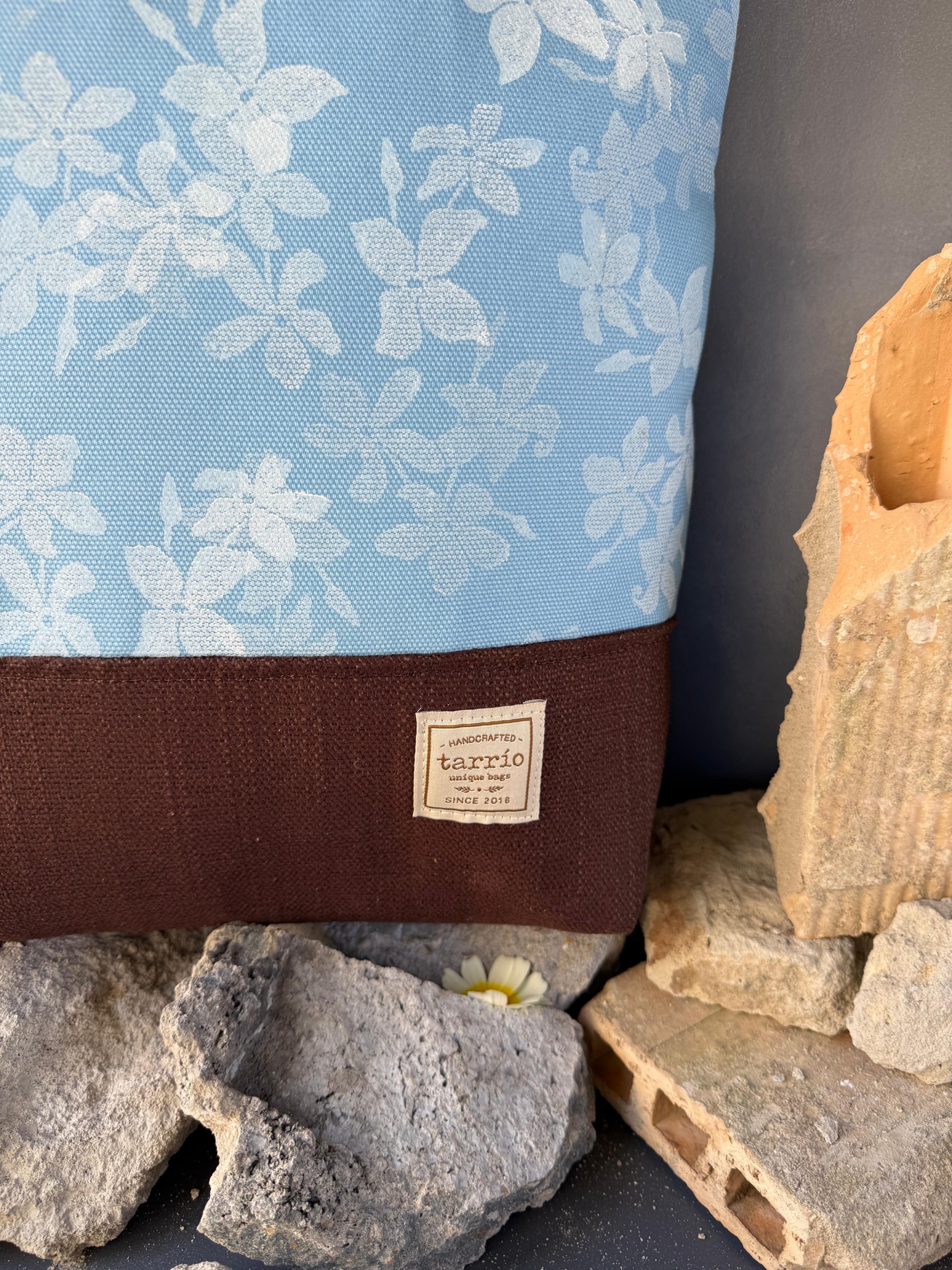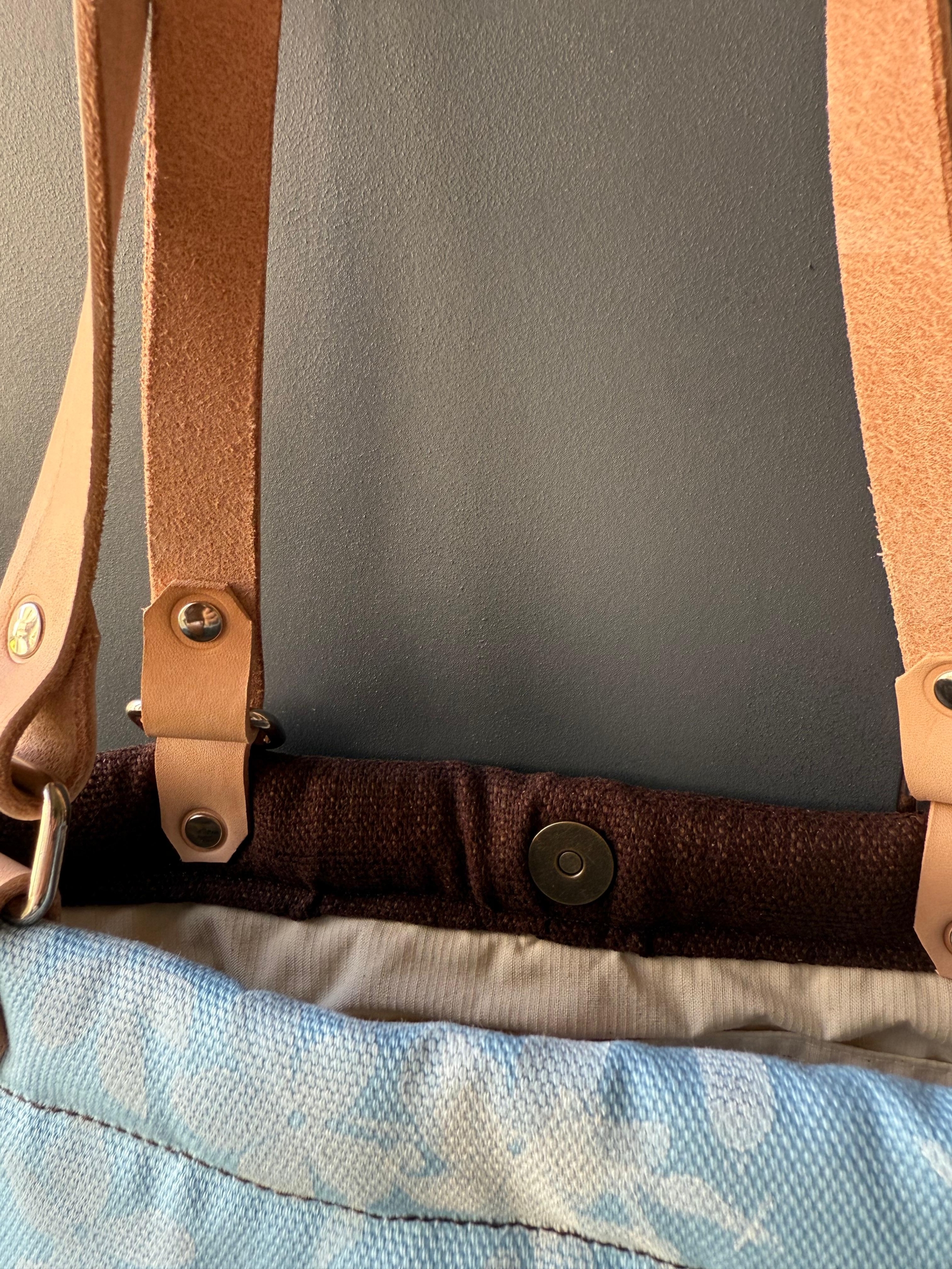 Materiales: Lona de algodón en color azul celeste y tapicería marrón oscuro; y piel de vacuno encerada (primera calidad, 3 mm.), color natural.