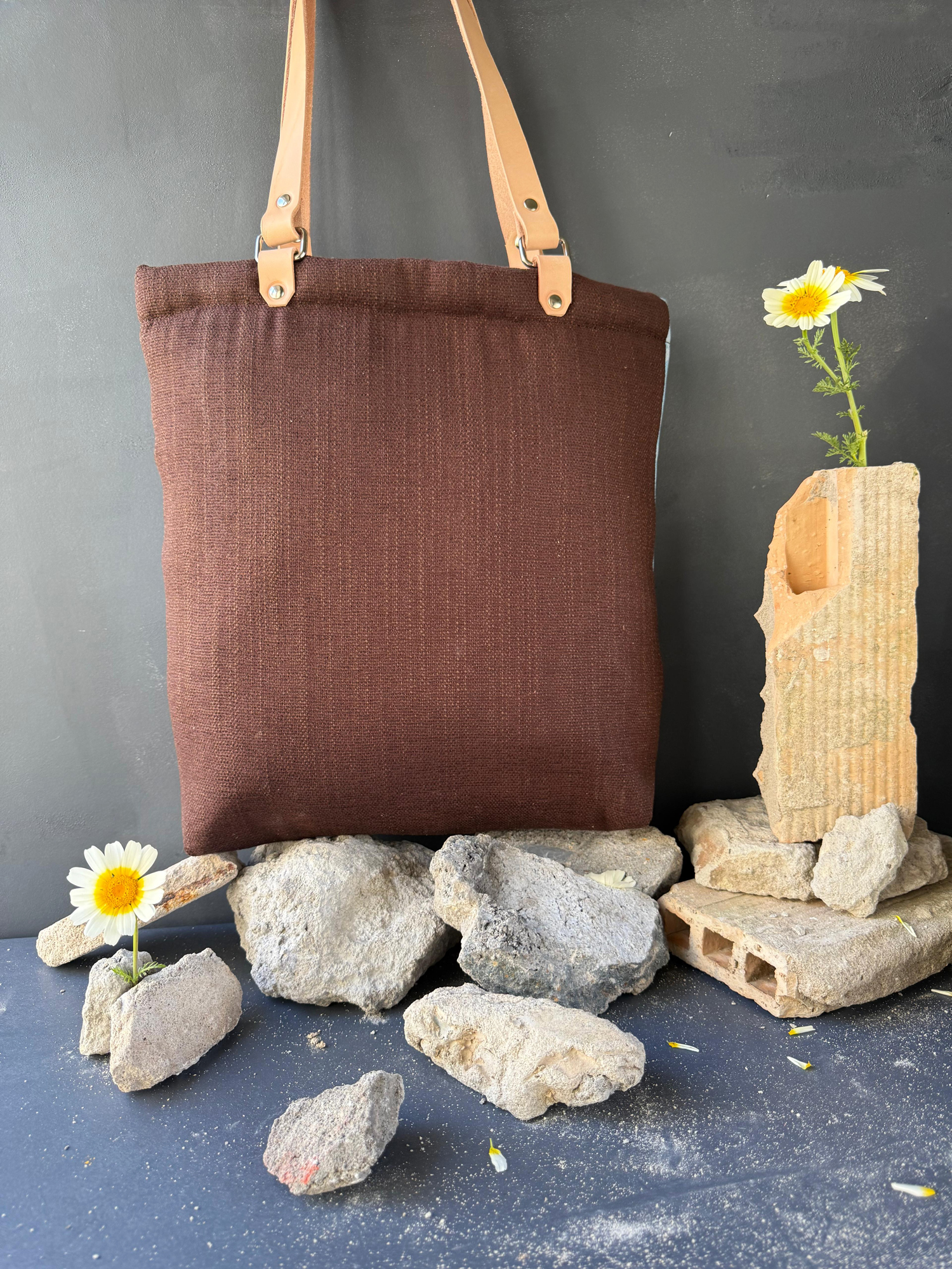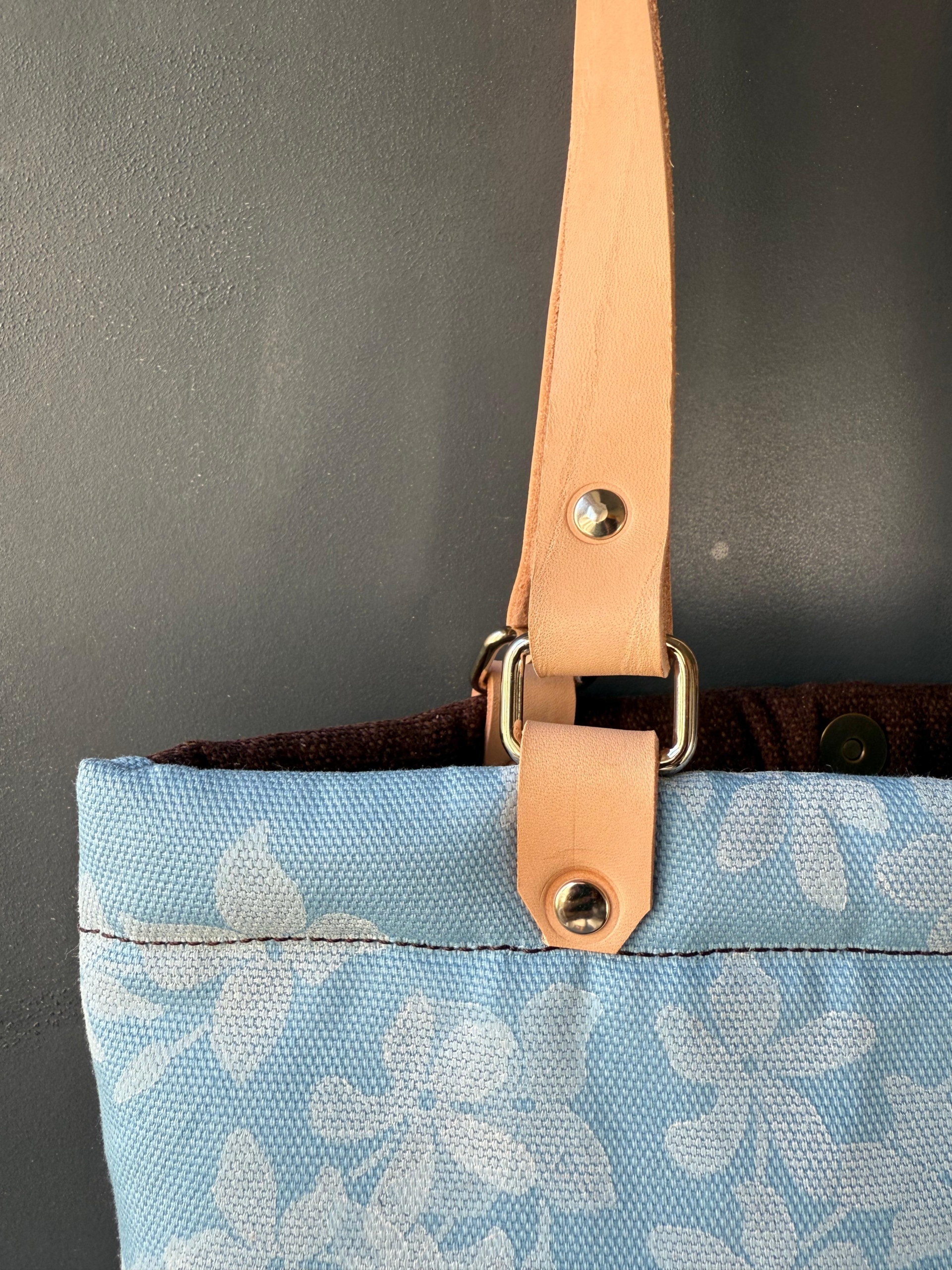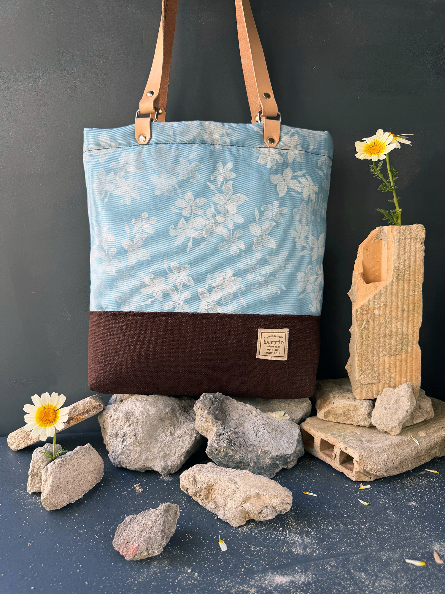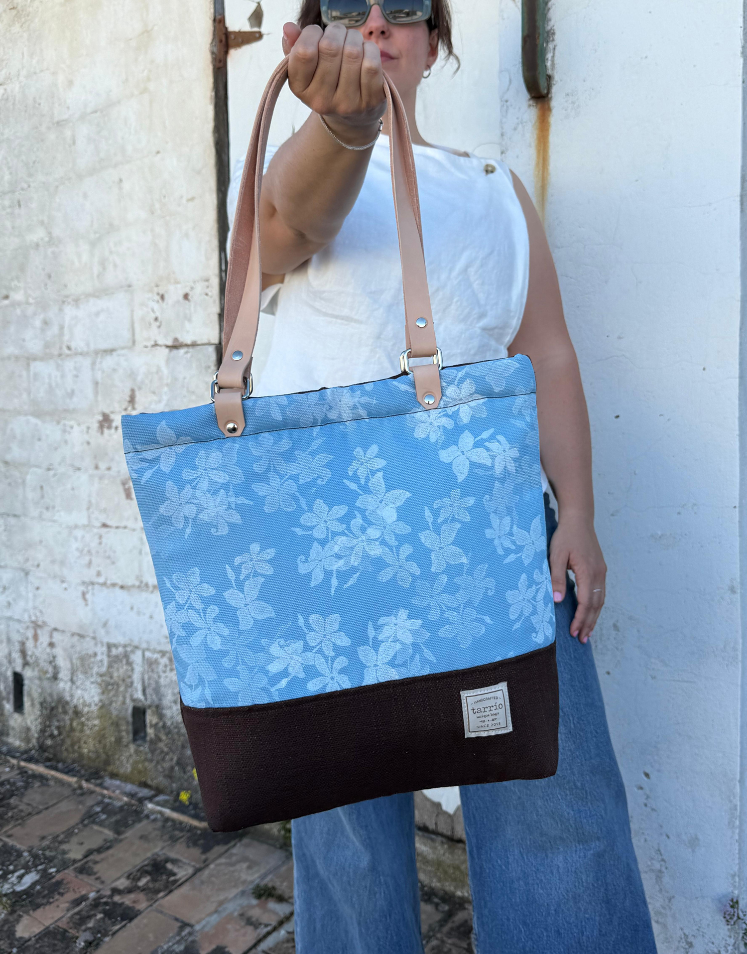Materiales: Lona de algodón en color azul celeste y tapicería marrón oscuro; y piel de vacuno encerada (primera calidad, 3 mm.), color natural.