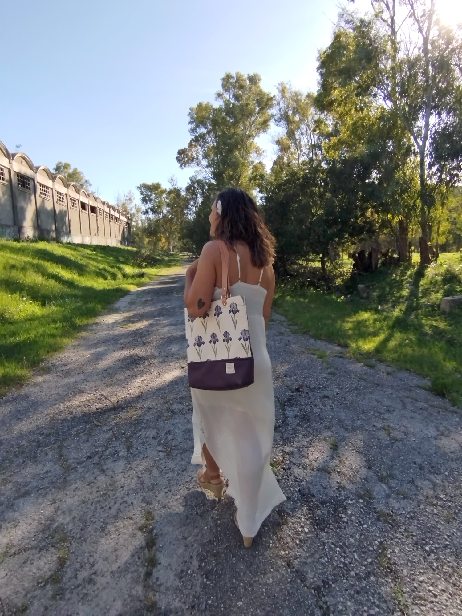 – Materiales: Lona de algodón en color crudo y tapicería morada; y piel de vacuno encerada (primera calidad, 3 mm.), color natural.